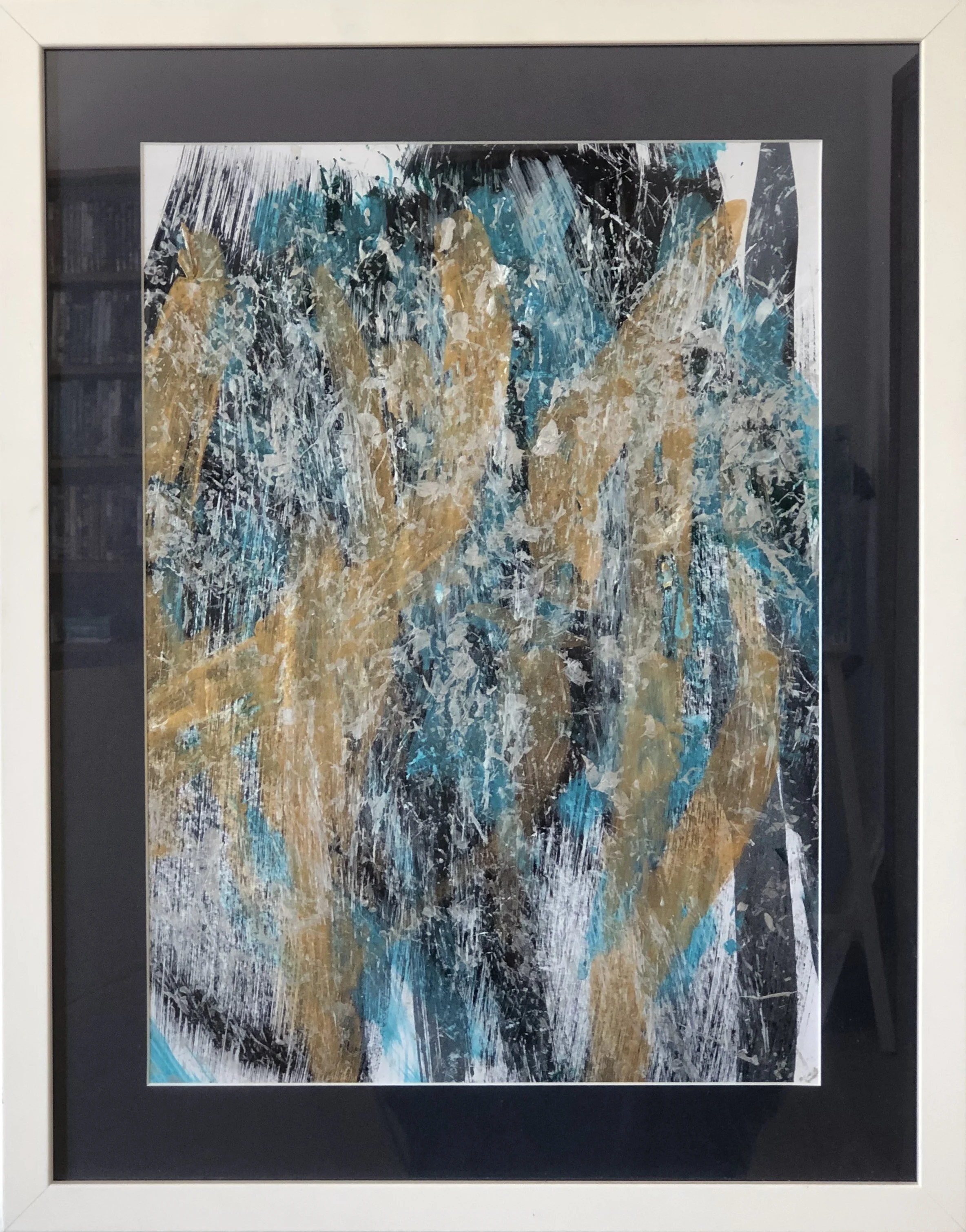 The first of it’s series, Strokes of Nature #1 displays a dry brushing of black, applied with a large brush in the background, allowing some of the paper’s bright white to show through. A medium brush has then been used to apply gold and turquoise paint, with a final layer of white acrylic applied using natural materials.